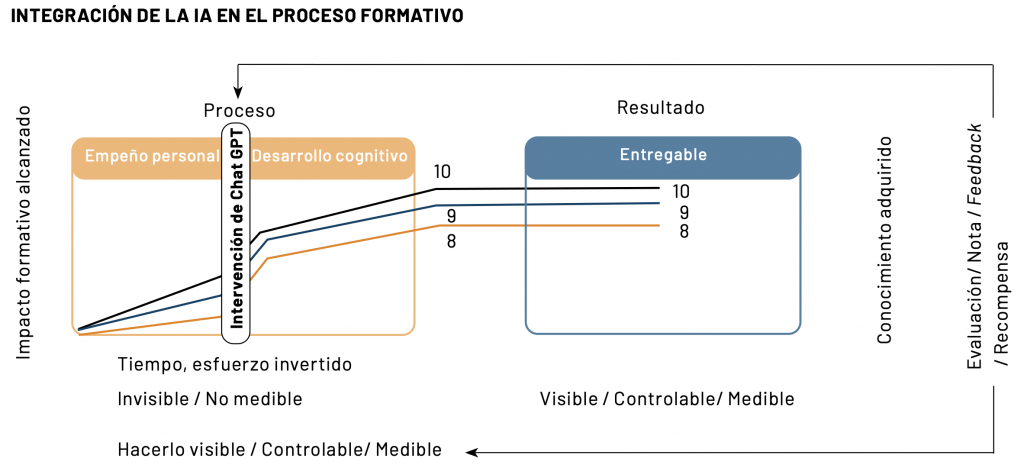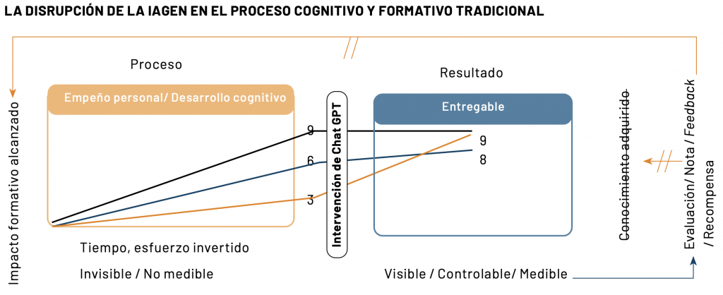 Durante décadas, la enseñanza universitaria ha descansado en una premisa: el producto final refleja el esfuerzo invertido. Pero la IA ha roto esa ecuación. Hoy, un estudiante puede entregar un ensayo impecable sin haber desarrollado un proceso formativo genuino. La figura 1 ilustra esta quiebra: la línea tradicional que conectaba tiempo, esfuerzo y conocimiento se ve interrumpida por la intervención de ChatGPT, que permite obtener resultados similares —o incluso superiores— con mucho menos desarrollo cognitivo.